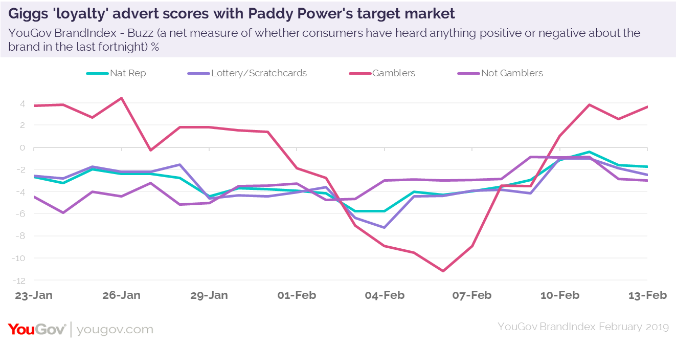 However, the subject of the advert does mean its audience is limited. Many won’t be aware of the Giggs scandal, particularly if they don’t follow sports or sporting celebrities. This is demonstrated by the differences in Paddy Power’s Ad Awareness score over the past few days (whether someone has seen or heard an advert broadcast by a company in the past two weeks). Based on a nationally representative sample, Paddy Power’s Ad Awareness score stayed fairly steady, decreasing if anything. However, the Ad Awareness score of consumers who have gambled in the last 12 months was much higher and rose from +24.4 to +29.9.