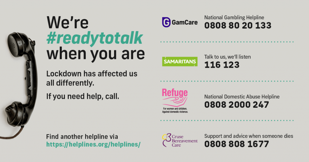 The #ReadytoTalk campaign is supported by GamCare, which runs the National Gambling Helpline, alongside Samaritans, Refuge and Cruse Bereavement Care.