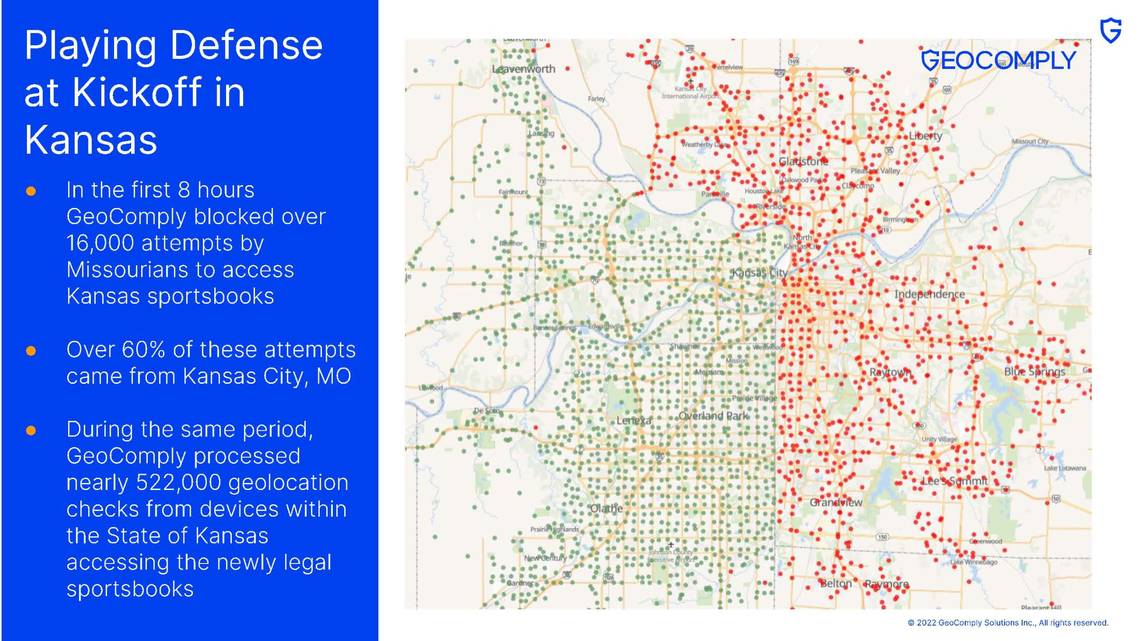 More than 522,000 geolocation checks were approved in the first eight hours of legalized sports betting in Kansas. Over 16,000 attempts in Missouri were blocked. GeoComply Solutions Inc.
