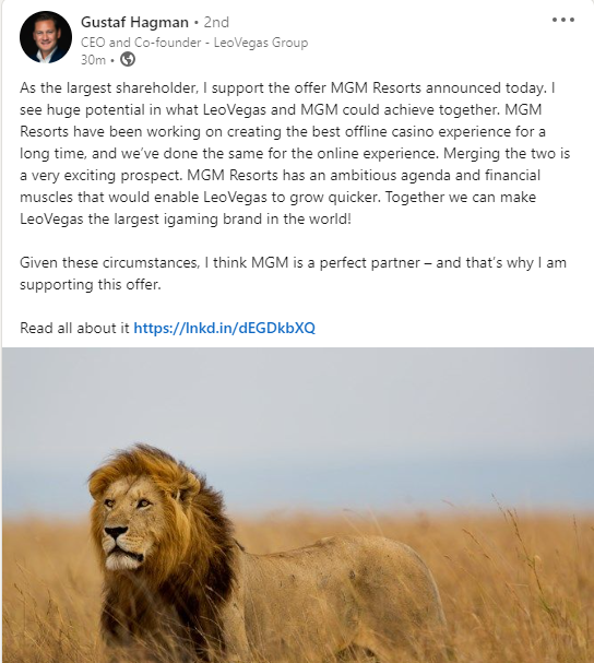 In a note, Regulus Partners said LeoVegas “has a lot to recommend it to MGM Resorts than a similar lionine logo”.