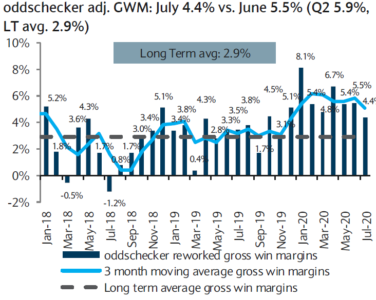 In addition, sports betting win margins were high once again at 4.4% compared with the lifetime average of 2.9%. This continues the operator-friendly trend in Q2 with an average of 5.9%.