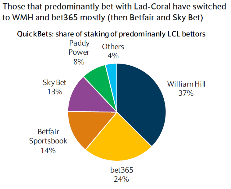 Punters that previously bet with Ladbrokes Coral (LCL) via oddschecker’s QuickBet function mainly switched staking to William Hill and bet365 after the GVC-owned operator departed the grid.