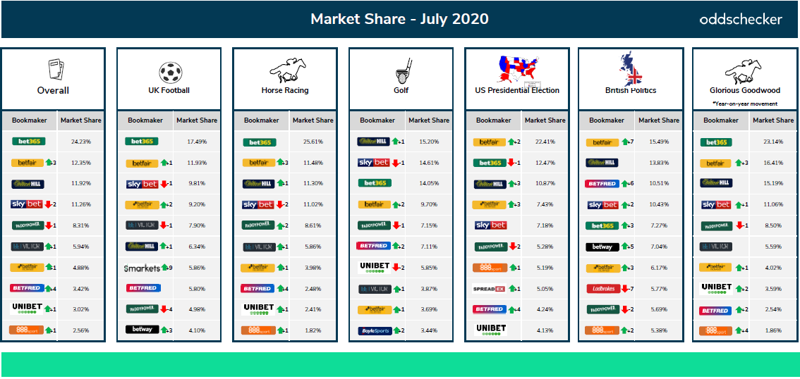 Betfair came out top for British politics (up seven spots) and the US Presidential Election, while William Hill was top for golf in July with 15.02% market share.