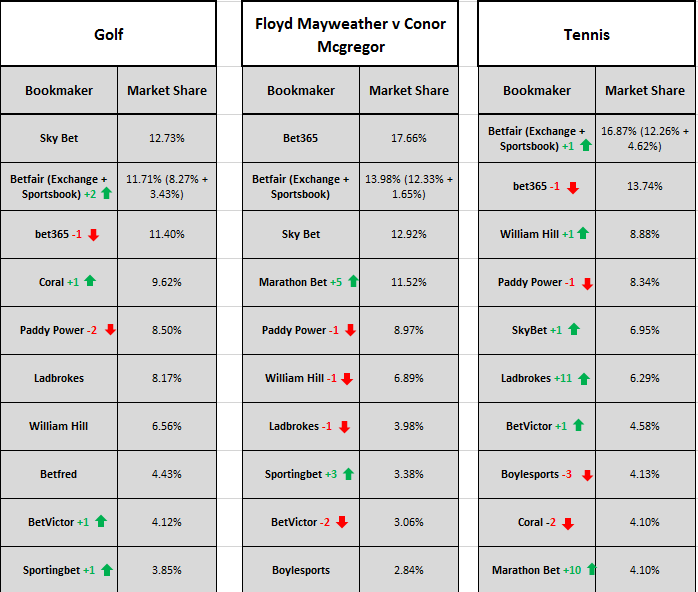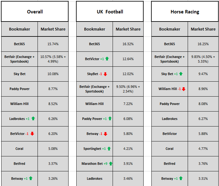 Across all sports, bet365 continued to dominate the rankings, with a 15.74% share for the month, ahead of Betfair with 10.57% and Sky Bet with 10.05%.