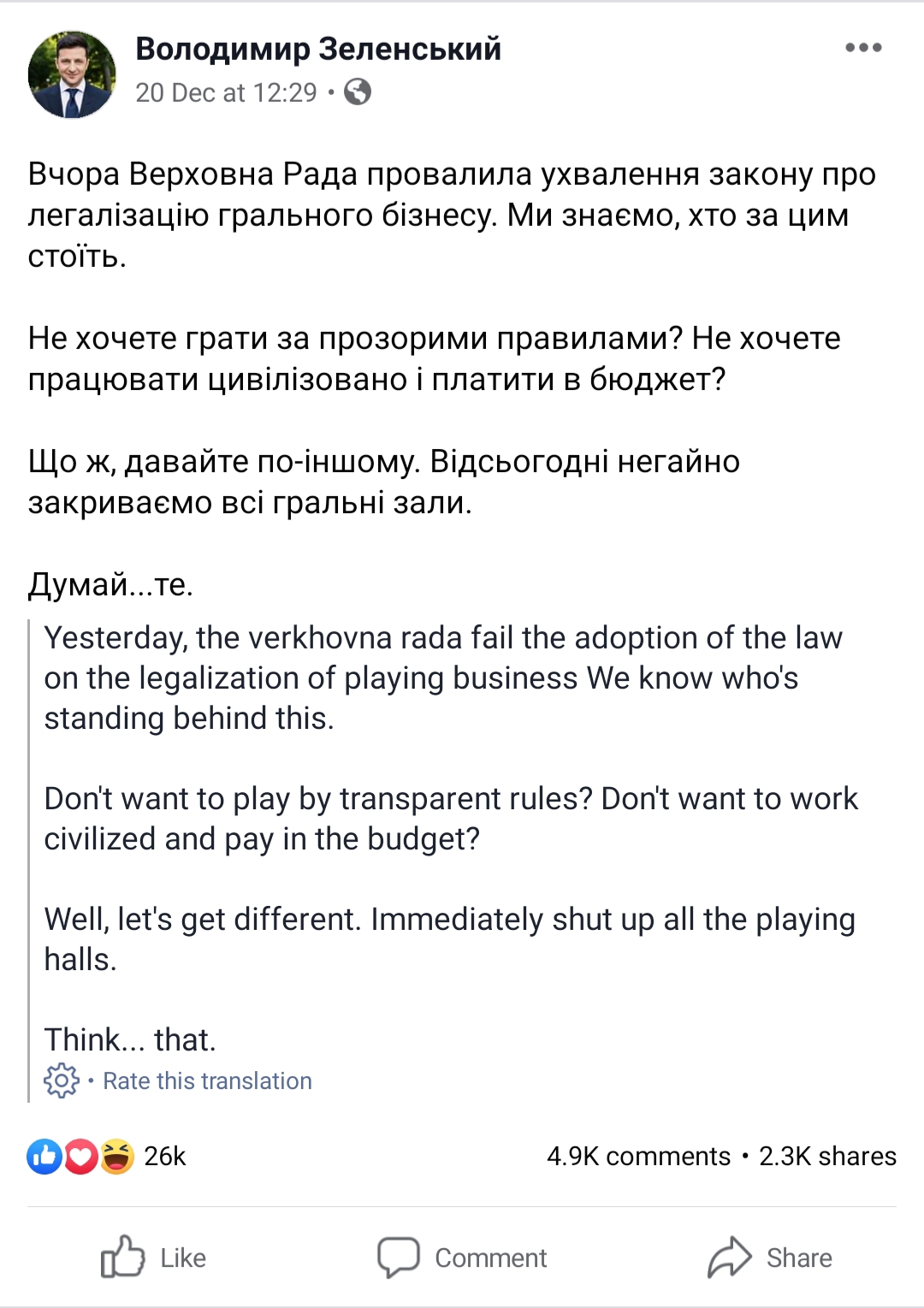 In the wake of the vote, Ukrainian President Volodymyr Zelensky criticised MPs for not voting to pass the legislation, taking to Facebook to attack illegal gambling operators.