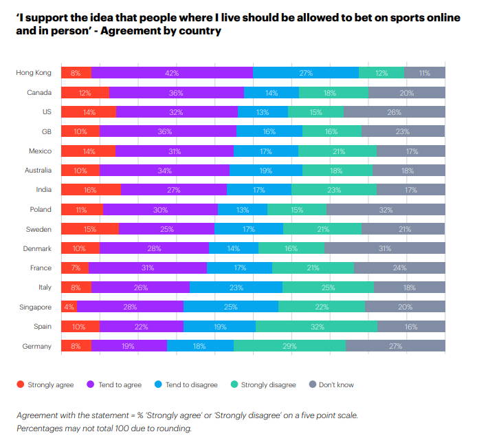 In its annual report, Global Gambling 2022: The consumer view in the gambling debate, survey data puts the US appetite for sports betting expansion just behind Canada, which polled a 48% positive response and level with the UK, with only Hong Kong at 50% polling more.