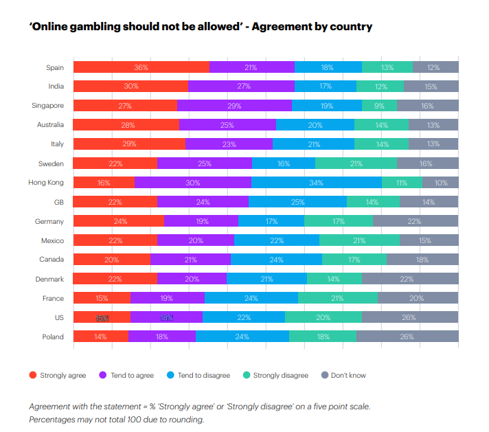 On a statement suggesting online gambling rules and regulations were too strict where they live, 54% of US survey respondents said they were unsure, a figure way ahead of all the other surveyed countries.