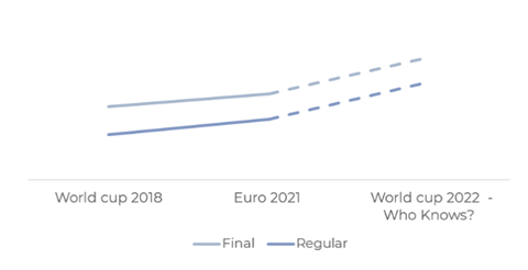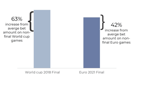 Will it shock you if we said the Final match drives higher betting sums? Probably not. Your gut feeling is absolutely right. But as always, it’s good to back that hunch with hard data and understand players’ behaviour during these past events. The average bet size during UEFA Euro 2020 was $12.36 during all regular games, but the average bet amount during the Final was an impressive $17.59. That’s quite the spike. In the FIFA World Cup 2018, the average bet amount during all regular games was $9.20, and the Final? The sum ballooned to a $15 average bet size.The value of an average bet on a regular game versus average bet on Final
