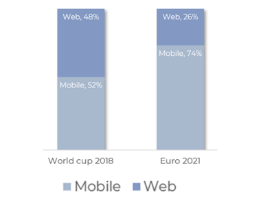 Once again, your hunch is probably spot on. Mobile betting is growing; desktop is shrinking. Takeaway? Focus your pre-match and live betting efforts during the Final on mobile; this is where the action is, big time. Fifty-two percent of total bets during the finals were placed using mobile devices, and during UEFA Euro 2020, a massive 74% of bets were placed on mobile. It’s fair to assume that the 2022 Final will put both to shame.Number of bets per platform