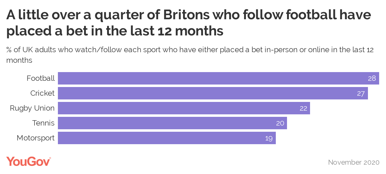 We found a little more than a quarter (28%) of UK adults who follow football have placed a bet in the last 12 months, the highest figure of the five major sports we looked at. Cricket is in a close second: 27% of its fans have gambled in the last 12 months.
