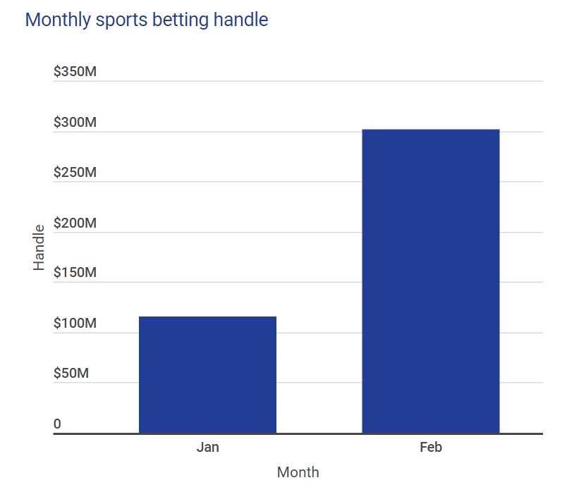 In February, its first full month of betting, handle came in at $301.9m. Comparatively, it took six months of online sports wagering in New Jersey for the Garden State to eclipse $300m in handle ($305m in January 2019). Of course, the two states do not present an entirely fair comparison when considering the staggered start for betting operators in New Jersey.