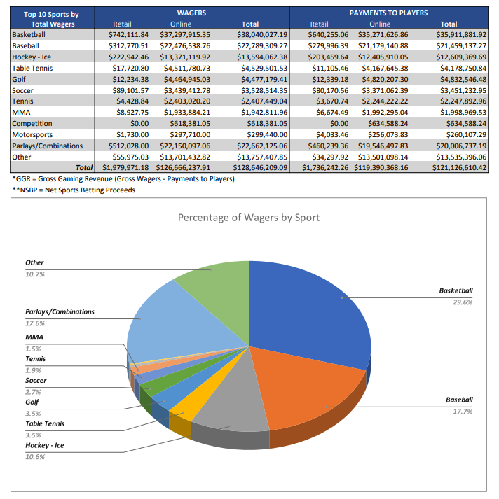 In terms of the sports bet on, the regulator revealed basketball accounted for 29.6% of all wagers with $38m staked. This was followed by baseball on 17.7% ($22.7m) and ice-hockey on 10.6% ($13.6m).