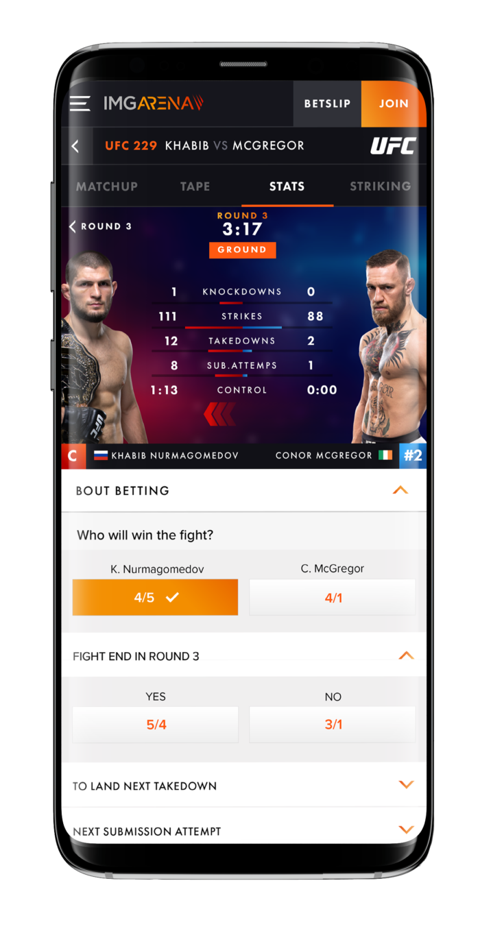 The product also features full branding, live 3D visualisations and official data points for live betting on key moments like knockdowns and takedown attempts.