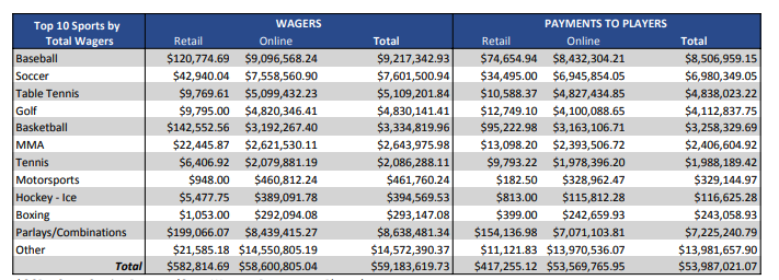 Baseball and soccer the most bet sports as online accounts for an overwhelming 99% of all wagers