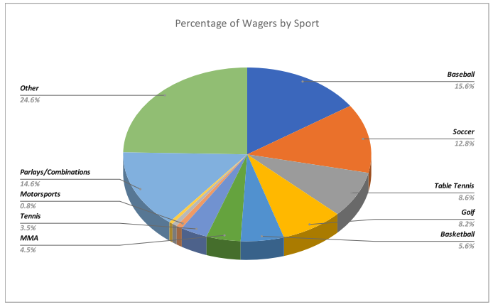 This was followed by soccer at 12.8% ($7.6m), table tennis at 8.6% ($5.1m), golf at 8.2% ($4.8m), and basketball with 5.6% ($3.3m). MMA, tennis, motorsports, ice hockey, boxing, and ‘other’ filled the minor placings.