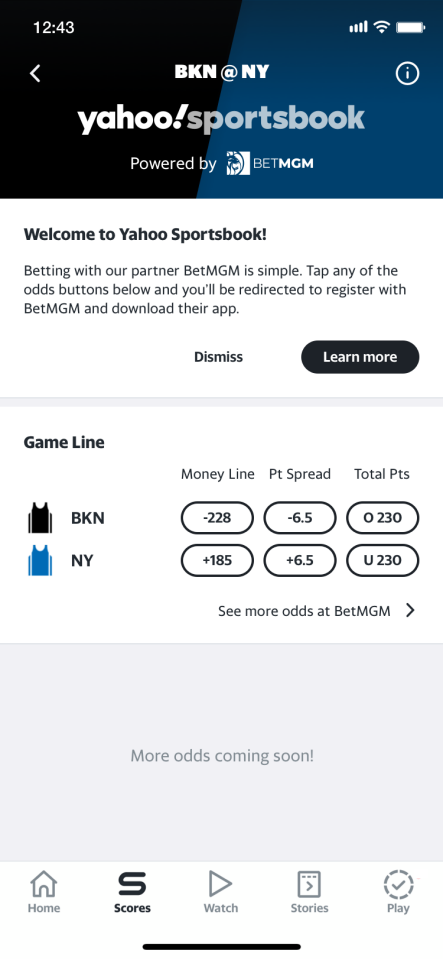 The Yahoo Sports app and desktop site displays odds via its own unique UI but will direct users to the BetMGM app to place bets.