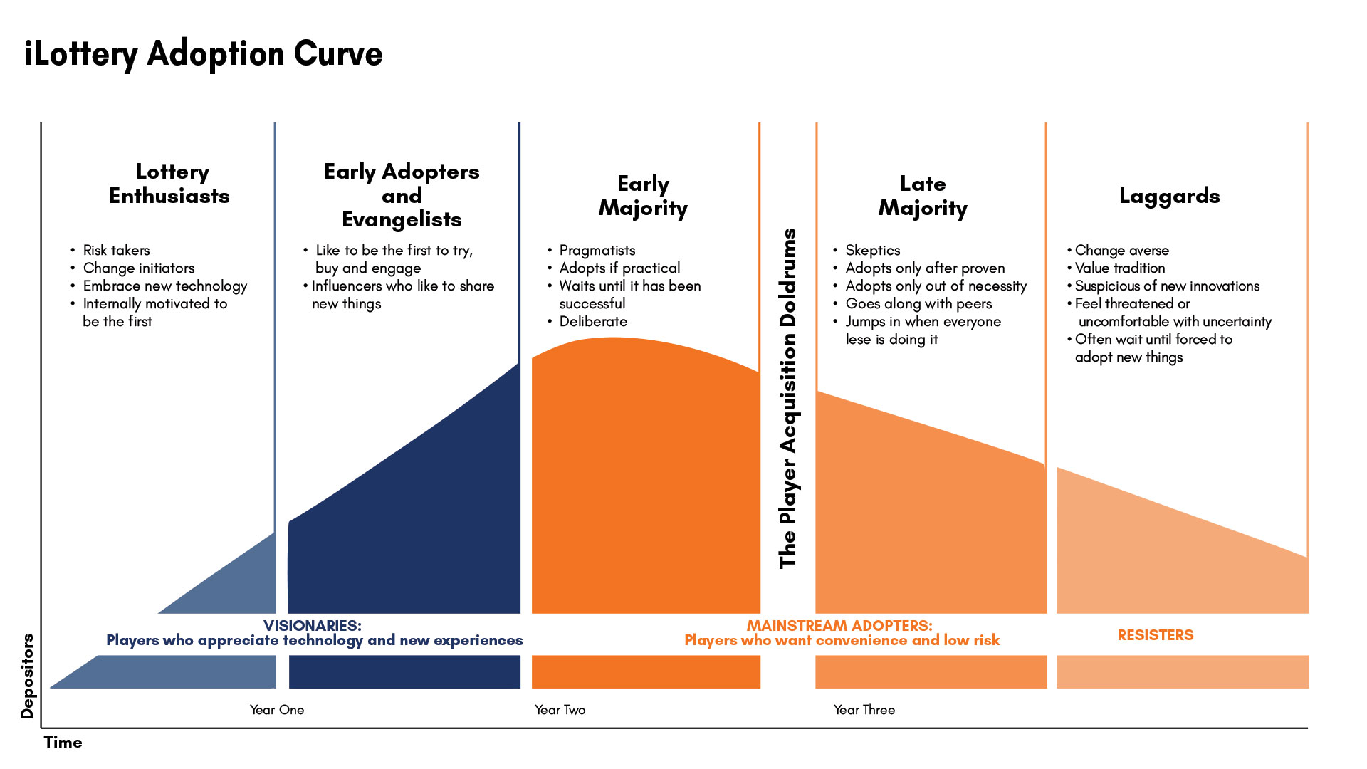 As an ilottery program matures into Year 3 and beyond, many early online players have succumbed to natural churn, and those who haven’t tried ilotteries are risk-averse and have high barriers to entry. This ‘late majority’ of players will require additional effort through player research and targeted marketing plans to attract these hard-to-convert consumers. This period is referred to as the ‘player acquisition doldrums’. In the ‘doldrums’, ilottery programs could face challenges in increased player churn, lower play frequency and lower average deposits compared to enthusiasts, early adopters, and the early majority. Subsequent years are even more challenging, as the change-resistant ‘laggards’ become the remaining cohort.